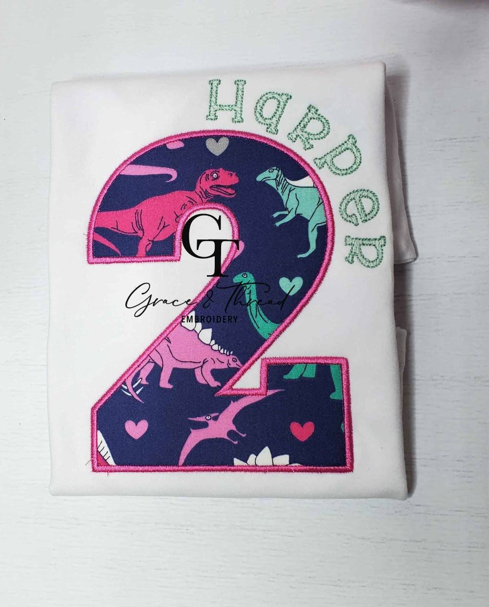Dino Applique Birthday Shirt, pink and purple dinos, custom Applique, Embroidered custom shirt. Number 2